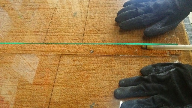 @ガラスにガラス切りで線を付けその線の下に切りを置き両方から押した様子です