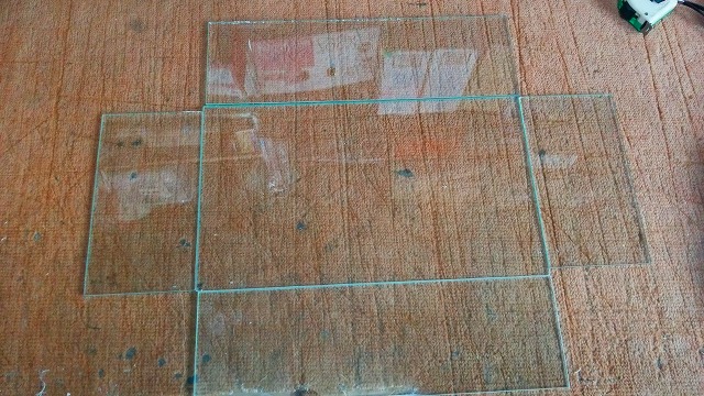 @ 一枚のガラスを無駄ないように水槽の寸法に書き込みます。