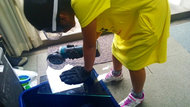 (ガラスの切り口をサンダーで磨いていている写真です)