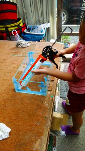 A水槽に組み立ててた内側をコーキングする為に養生テープを貼ります。