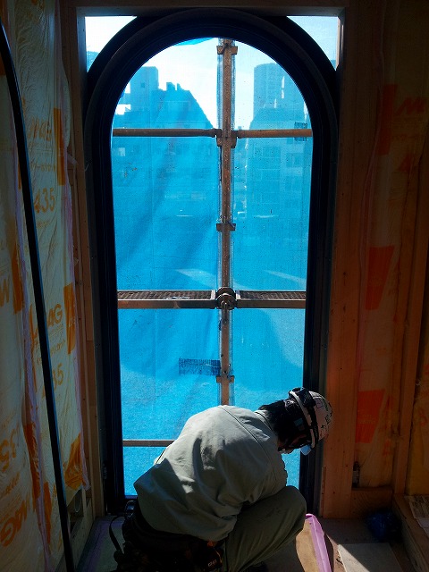 ガラスの上部が丸く変形しているサッシにペアガラスを入れてきました。